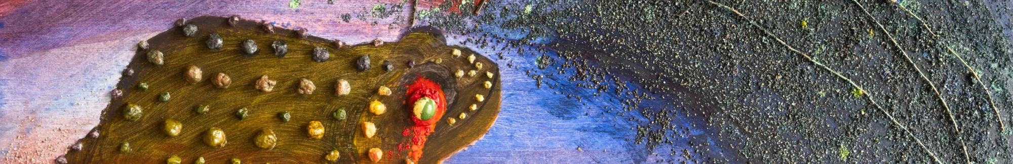 Utilisant peintures, pigments et pastels auxquels il n’hésite pas à incorporer sables, cailloux et coquillages, mica et poudre d’or, l’artiste crée ainsi un monde coloré et poétique dans lequel figuration et abstraction se mêlent harmonieusement.
